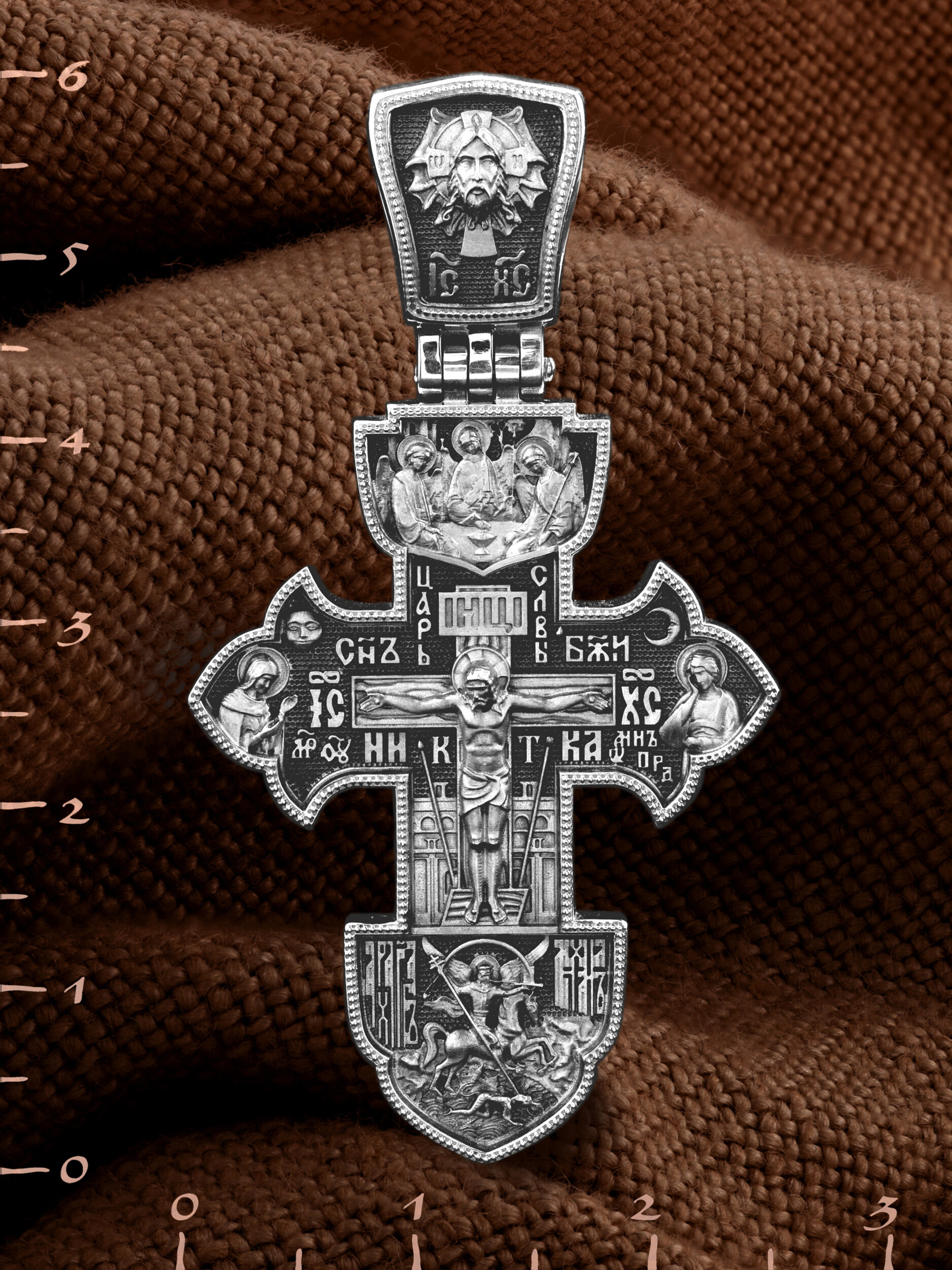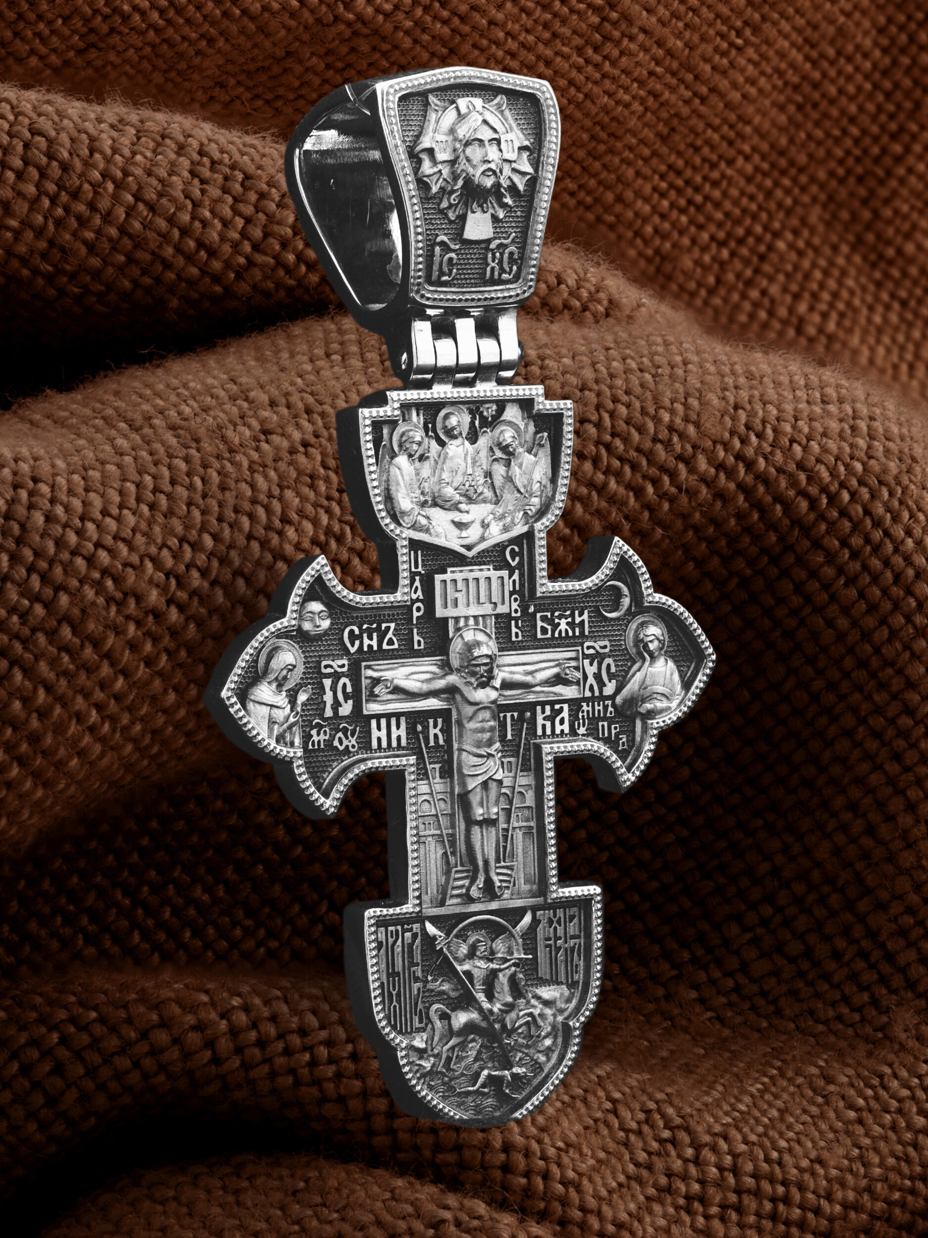 На лицевой стороне креста изображено Распятие Господа и Спасителя нашего Иисуса Христа. Крест- символ спасения и искупления рода человеческого, знамение победы над смертью и адом. Иисус Христос, как искупительная жертва освобождения человечества от власти греха, умер крестной смертью и в третий день воскрес. На верхней табличке, выше головы Иисуса, расположена надпись, составленная Понтием Пилатом — «IНЦI». Она означает «Иисус Назорей, Царь Иудейский». Распятие сопровождается каноническими надписями. Над Распятием находится надпись «Царь Славы». Надпись «IС» « ХС» означает Иисус Христос и помещается на разных сторонах поперечной (большой) перекладины креста. Рядом расположены надпись «Сын Божий» и слово «НИКА», что означает «победитель». Слева от Распятия изображена Пресвятая Богородица, справа — апостол и евангелист Иоанн Богослов, один из ближайших учеников Иисуса Христа. За Распятием высится Иерусалимская стена, в знак того, что Господь был распят вне стен города. Вдоль креста изображены копие сотника Лонгина и трость с губкой и буквы «К» и «Т». Рядом — слово «НИКА», что означает «победитель». Над распятием помещено изображение иконы Святой Троицы в виде трех ангелов. Ниже распятия изображен Архангел Михаил, восседающим на огненном крылатом коне. От уст архангела исходит труба, возвещающая наступление Второго пришествия и Страшного суда, а над его распростертыми крыльями изображена радуга. Копьем с крестом он пронзает поверженного сатану. На кулонном кольце изображен Нерукотворный образ Господа и Спасителя нашего Иисуса Христа, чудесно отпечатавшийся на плате, котором Христос вытер свой лик.