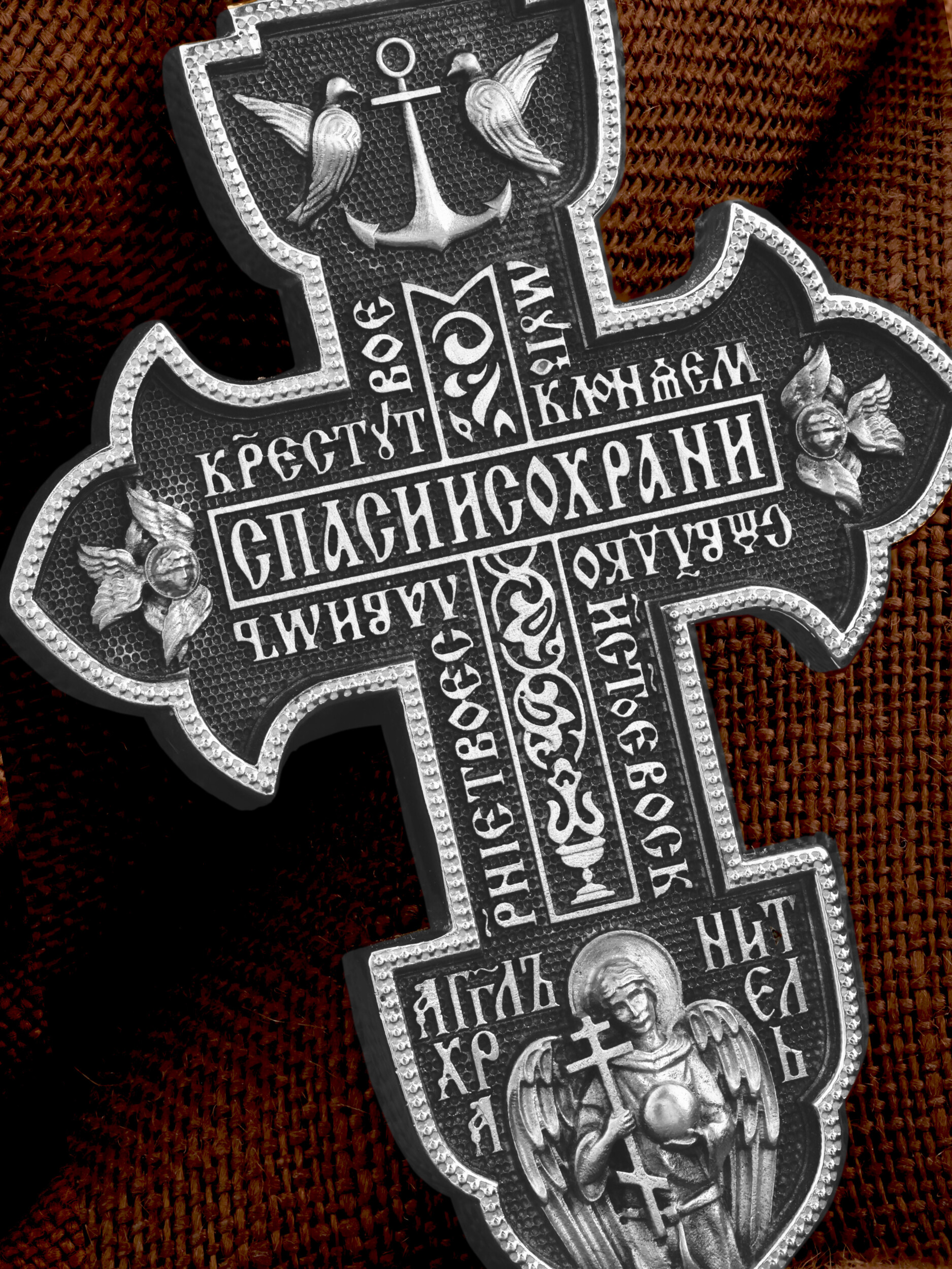 В центральной части оборотной стороны креста написана молитва: «Спаси и сохрани». Рядом — песнь: «Кресту Твоему поклоняемся, Владыко, и святое Воскресение Твое славим». Ниже изображен святой Ангел-Хранитель в виде прекрасного юноши держащего в правой руке крест, а в левой — сферу.. На кулонном кольце изображен Ангел Серафим.