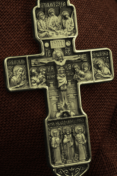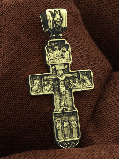 На концах горизонтальной балки креста помещены образы вселенских святителей и творцов литургии Василия Великого и Иоанна Златоуста. В кулонном кольце изображены райские врата с их стражем — Херувимом. Врата, которые открылись благодаря крестной жертве Христа.