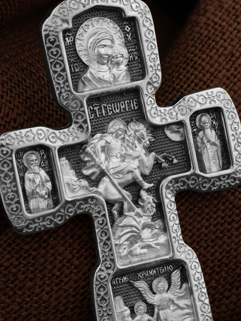 В центральной части оборота креста изображен Георгий Победоносец — покровителем и защитником воинов.