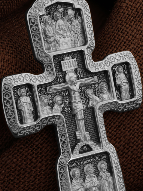 На кулонном кольце помещено изображение Спаса Нерукотворного — образ Спасителя, который Он запечатлел на плате и передал для исцеления больному проказой царю Эдессы. Ему придается победное и защитное значение.