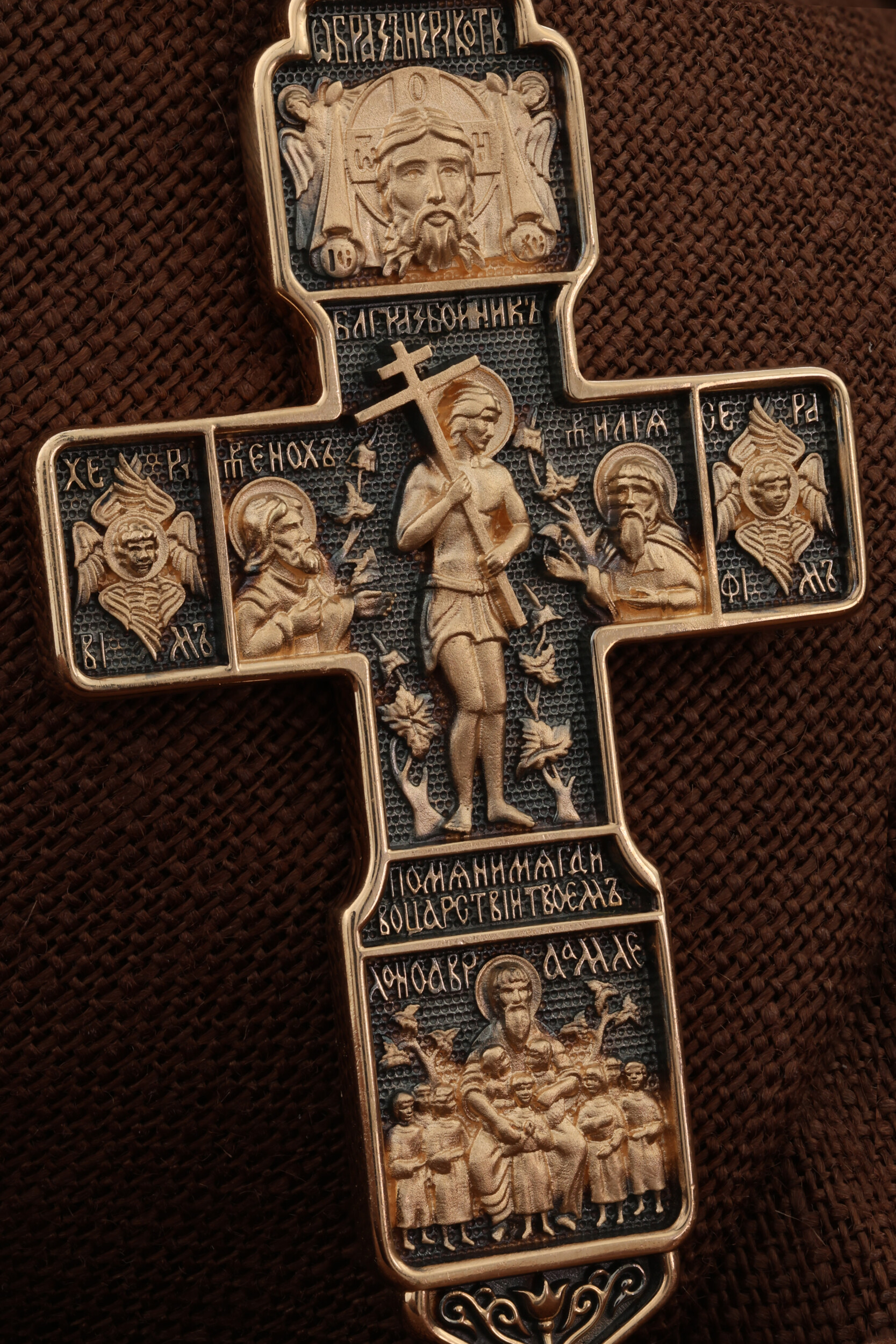 В нижней части креста изображены образы первых русских святых князей-мучеников — Бориса (князь ростовский) и Глеба (князь муромский) и святого равноапостольного князя Владимира. Страстотерпцам Борису и Глебу молятся об умиротворении Отечества, о добром нраве властей и правителей, о сохранении от междоусобицы, о даровании мужества перед лицом смертельной опасности. С Борисом и Глебом неразрывно связан образ их отца — святого равноапостольного князя Владимира, который также почитается как защитник и покровитель Русской Земли и Церкви. В молитвах его называют «отец русский» или «отец всея Руси».