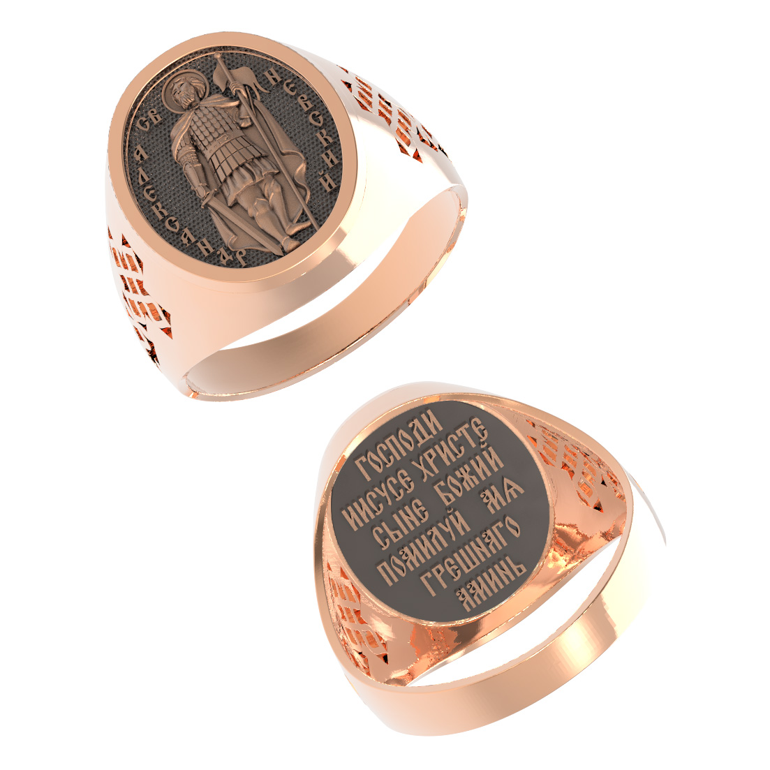 На лицевой стороне кольца помещен образ святого бла¬го¬вер¬ного великого князя Александра Невского (1220−1263г.г.). Родился он в семье князя Ярослава Всеволодовича и княгини Феодосии. В первые годы княжения русский князь занимался укреплением Новгорода. Славу молодому новгородскому князю принесла победа, одержанная в июле 1240 г. в устье р. Ижоры над шведским отрядом, после которой шведская агрессия на новгородско-псковские земли была остановлена. Вскоре против русского князя выступило большое конное войско во главе с магистром ордена и вынудило его отвести свои отряды к границе Ливонского ордена, проходившей по Чудскому озеру. 5 апреля 1242 г. произошло решающее сражение на льду Чудского озера у Вороньего камня, вошедшее в историю как «Ледовое побоище». Немецкие войска потерпели сокрушительное поражение. В дальнейшем Александр Невский продолжал укреплять северо-западные границы Руси. Александр прилагал много усилий для укрепления великокняжеской власти в стране. Его политическая линия способствовала предотвращению разорительных нашествий татар на Русь. Несколько раз он сам ездил в Золотую Орду, добившись освобождения русских от обязанности выступать войском на стороне татарских ханов в их войнах с другими народами. Последнее его пребывание в Орде продолжалось в течение года и потом подкосило его жизнь. Закончил от свой жизненный путь как инок Алексий. Его тело было погребено во Владимирском монастыре Рождества Богородицы.