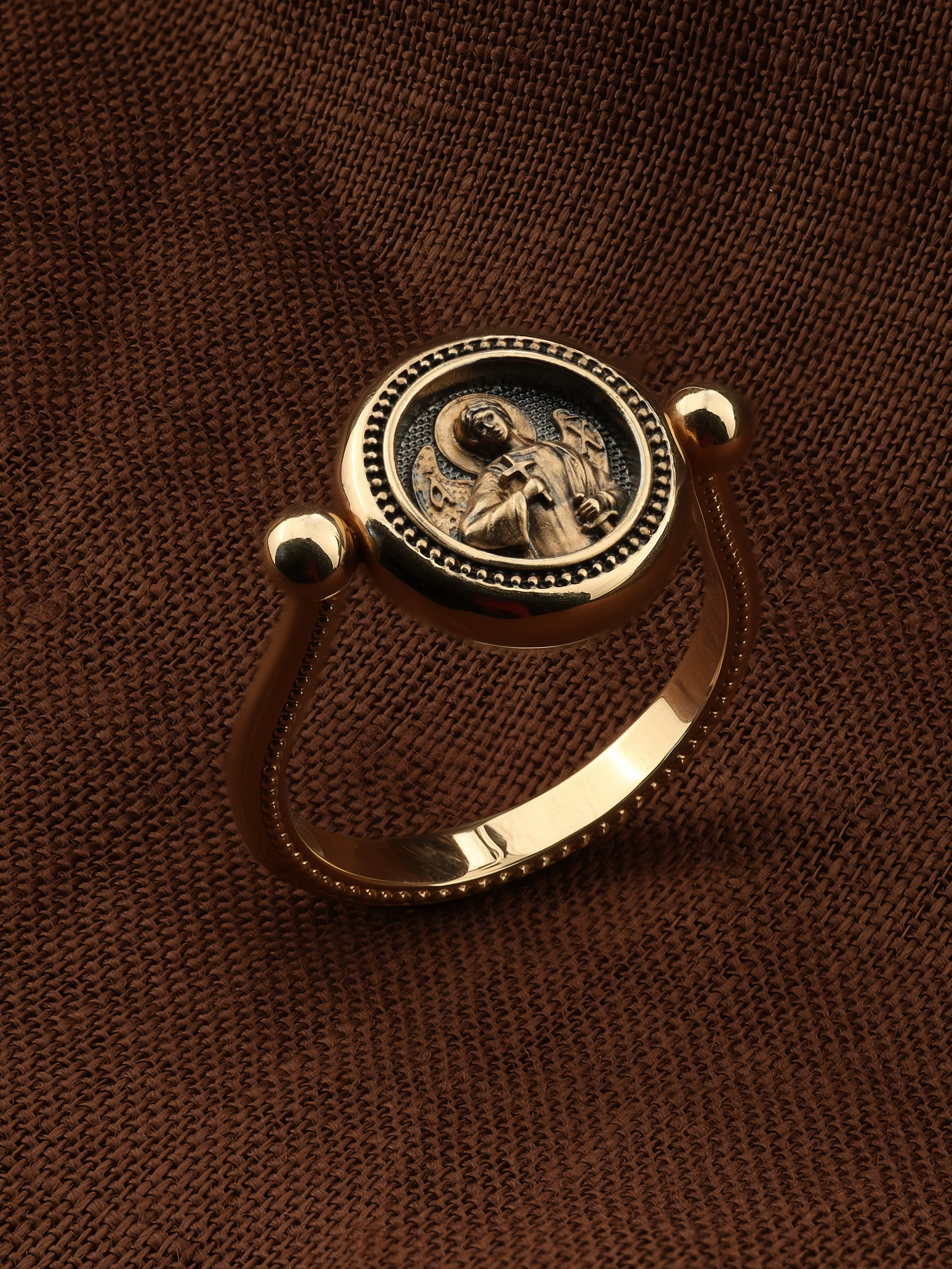 На перстне изображен Ангел Хранитель. По Православному учению, каждому, принявшему святое крещение, дается Господом Ангел Хранитель, который сопровождает человека всю его жизнь, помогая в добрых делах и охраняя от нападок злых духов. Святые отцы утверждают, что только верующий человек имеет рядом с собой Ангела Хранителя: «Тем, которые сподобились крещения и возносятся на высоту добродетелей, даны от Бога Ангелы, заботящиеся о них и содействующие им. В этом уверяет нас Господь, когда говорит, что есть Ангелы Хранители у всякого, кто верует в Него» (преп. Анастасий Синаит). Но Ангел Хранитель пребывает с христианином, если только мы не прогоним его греховными делами, поскольку «как дым разгоняет пчел, так и грех прогоняет от нас Ангела Хранителя» (свт. Василий Великий). Но и после завершения земного пути Ангел Хранитель не покидает христианина, а помогает душе преодолеть воздушные мытарства на пути в Царство Небесное.