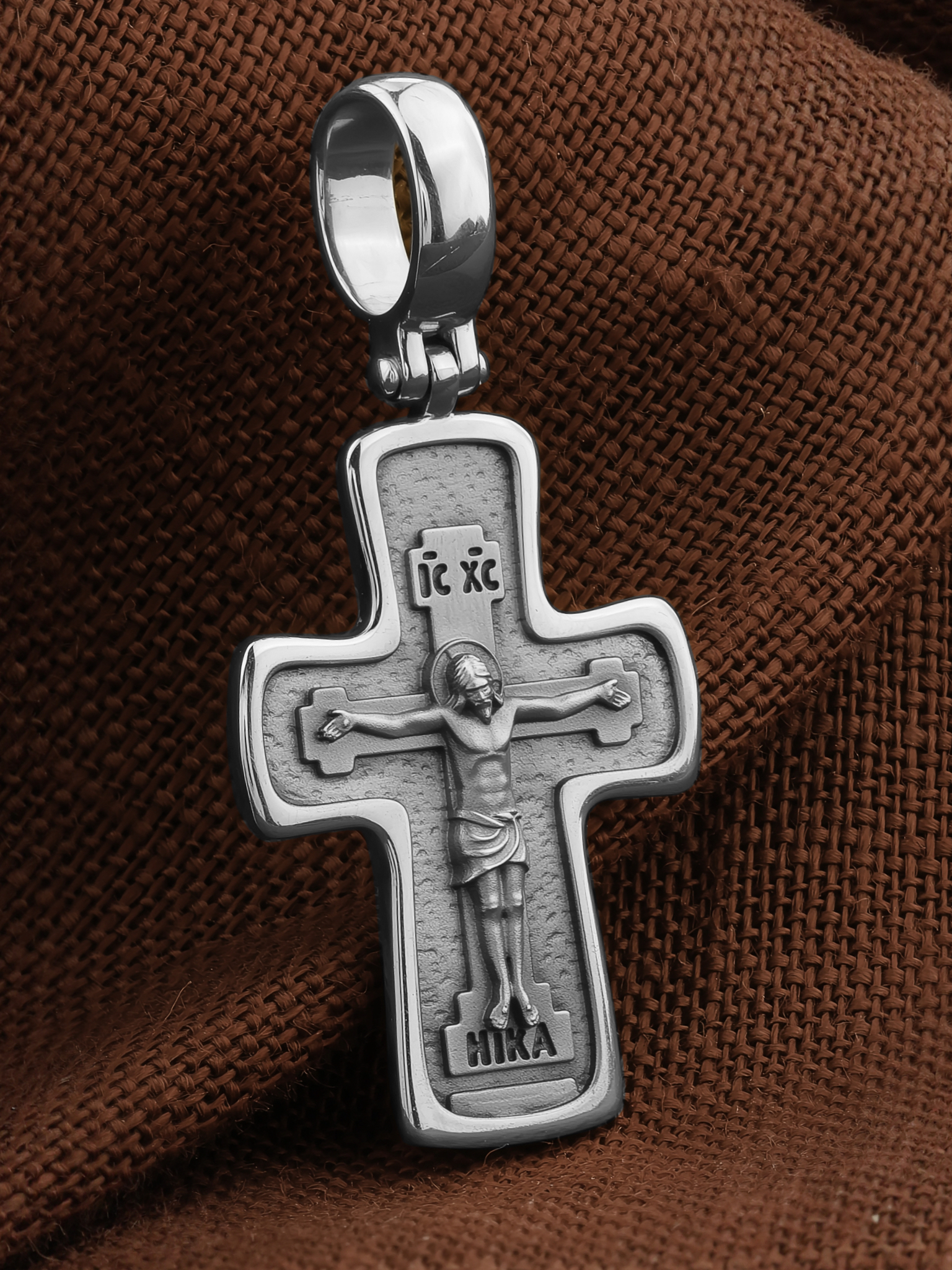 На лицевой стороне креста изображено Распятие Господа и Спасителя нашего Иисуса Христа, отдавшего Себя на смерть, для искупления грехов мира. Крест является символом жертвенной любви Всеблагого Бога к падшим людям, всепобеждающим духовным оружием христиан, основанием и средоточием церковной жизни. Господь сказал: кто хочет идти за Мною, отвергнись себя, и возьми крест свой, и следуй за Мною. (Мк. 8: 34). Надпись «IС ХС» означает Иисус Христос. Надпись –«НИКА» означает победитель.