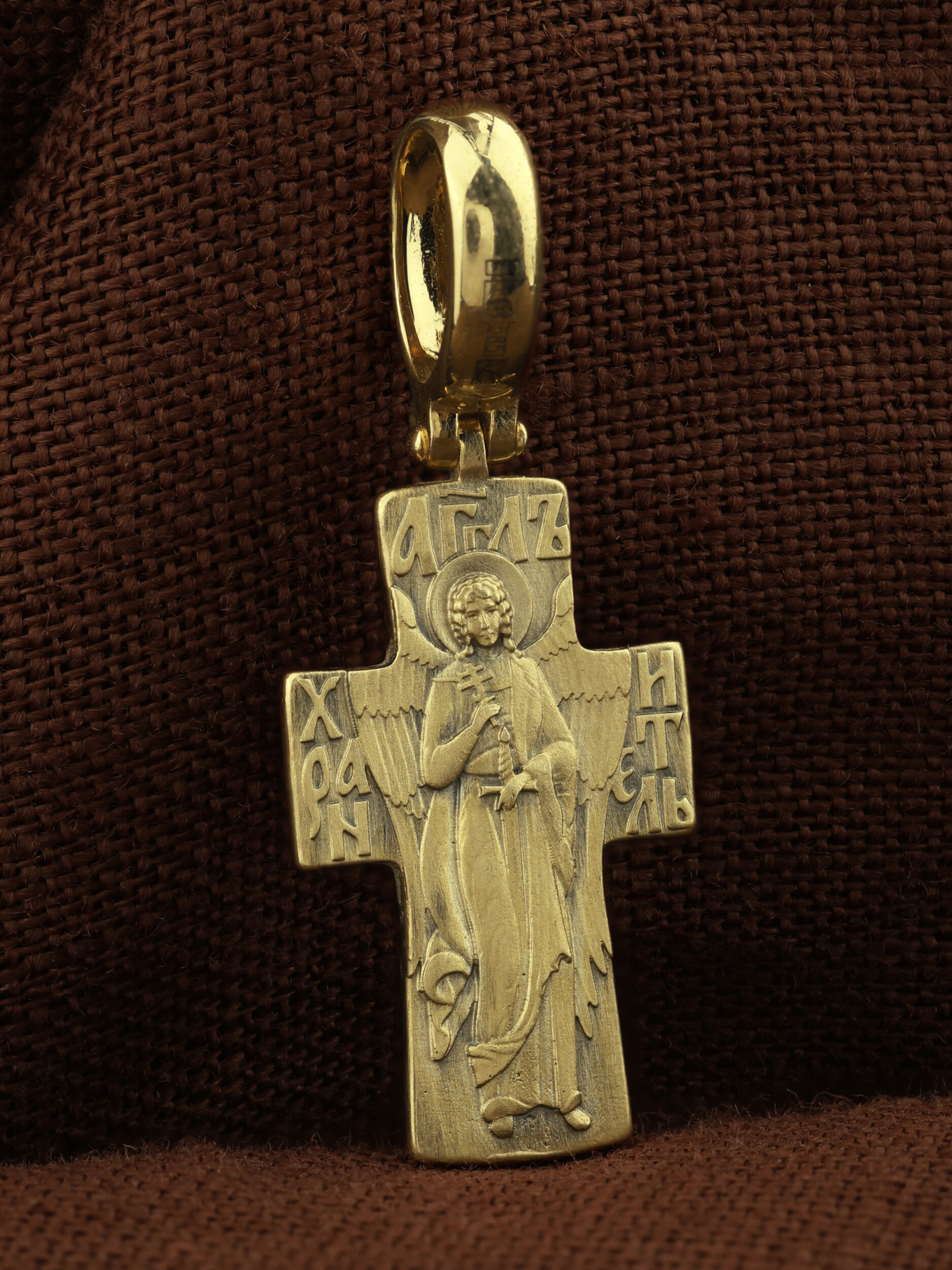 На оборотной стороне креста изображен Святой Ангел-Хранитель. Это Ангел приставляемый Богом к человеку при крещении для охраны и помощи в добрых делах. Он невидимо находится при человеке на протяжении всей его жизни, если человек сохраняет в себе любовь к Богу и истинную веру перед Ним. Ангел-Xранитель делают для нас все, что служит к истинному нашему благу и спасению. Невидимо пребывая при нас постоянно, он наставляет нас на все доброе и полезное, возносит наши молитвы к Богу, охраняют и защищают нас от врагов видимых и невидимых, ходатайствует за нас пред Богом.